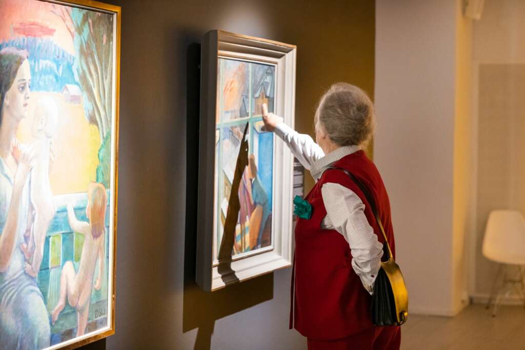 Opastuksella Franciska Sundholm kertoo taiteilijaisästään Gösta Diehlistä näyttelyn teosten äärellä.