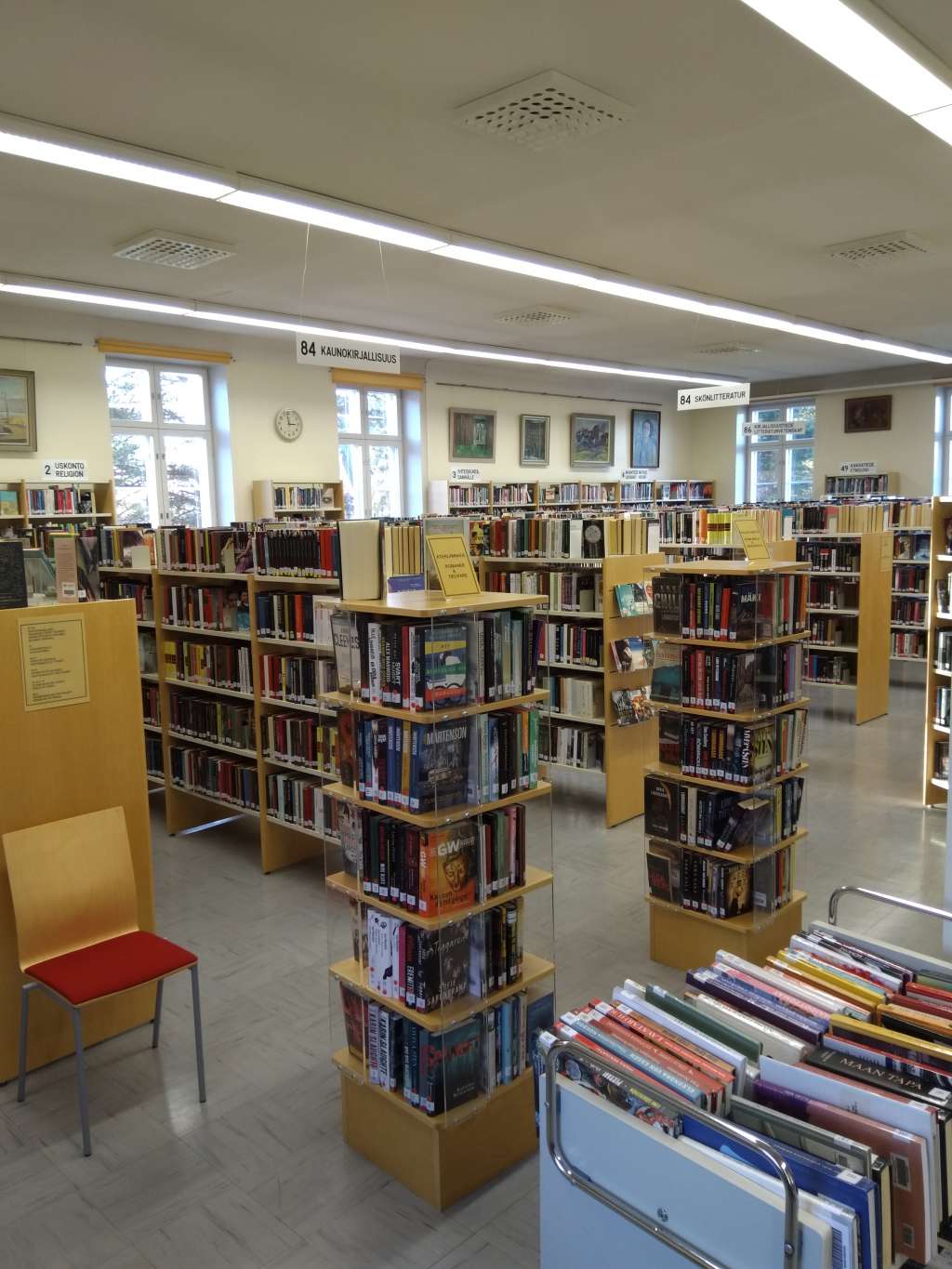 Palautusluukku sijaitsee talon päädyssä Pursimiehenkadun puolella. Hissi ja invaluiska sijaitsevat takaovella päiväkodin puolella, joten kirjastoon on helppo tulla myös esim. lastenvaunujen kanssa.