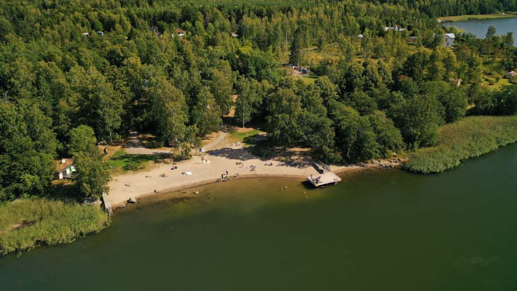 Pysäköintialue on sadan metrin päässä uimarannasta, nurmialueen vieressä.