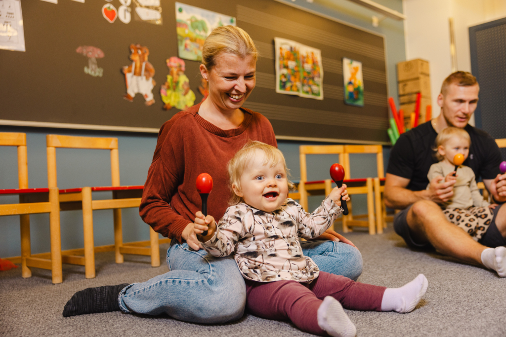 Tunneilla soitamme, liikumme ja tanssimme yhdessä. Perheryhmissä aikuiset osallistuvat muskarin toimintaan, ja lapsi on oman aikuisen vastuulla.