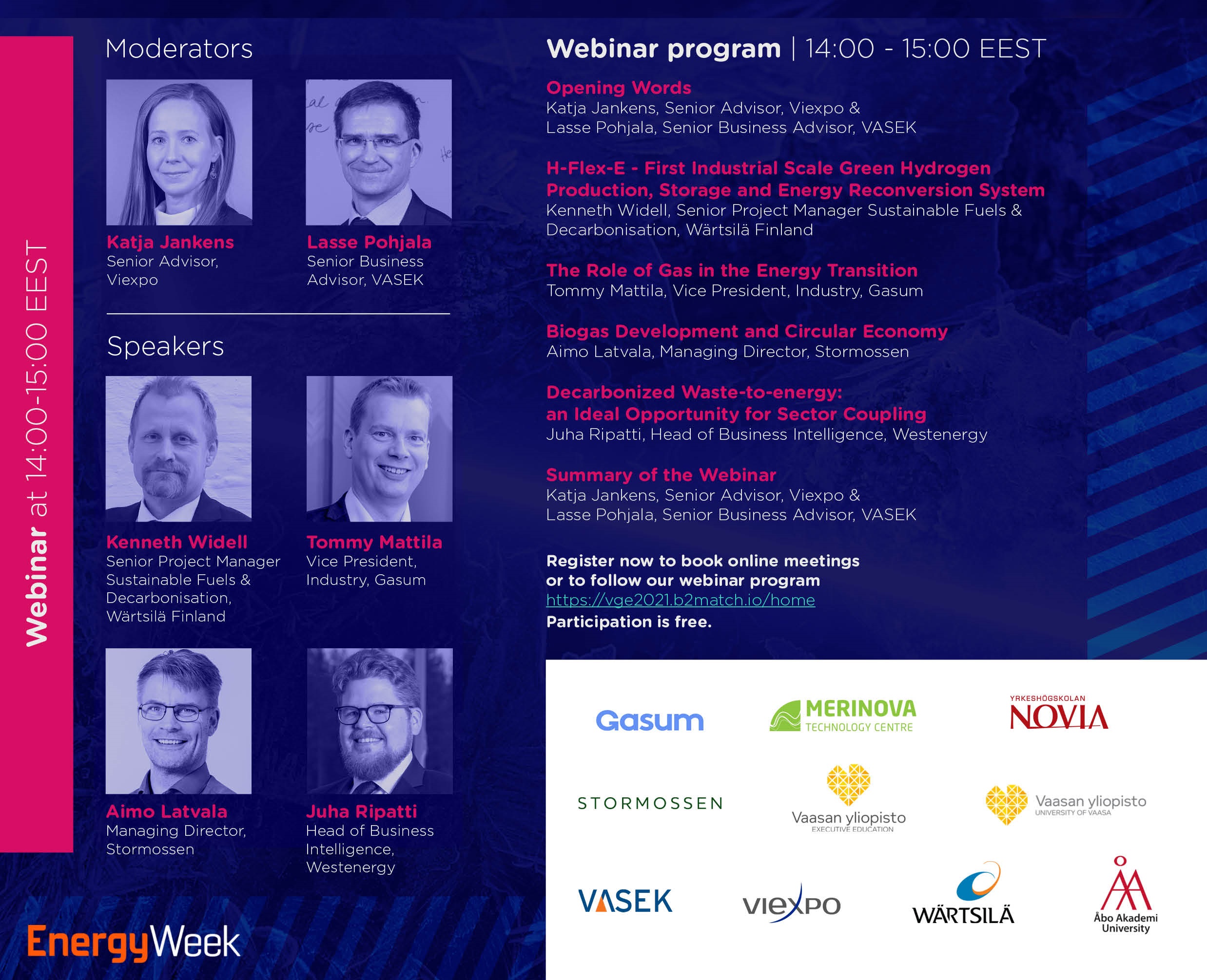 In the webinar, the audience will hear interesting experiences about industrial scale green hydrogen production. Other topics of the webinar are the role of gas in the energy transition and the development of biogas within circular economy. The webinar will also discuss the ideal opportunities for sector coupling. By attending, you will learn more about how the use of gaseous fuels in different forms is enhancing both business and operations.