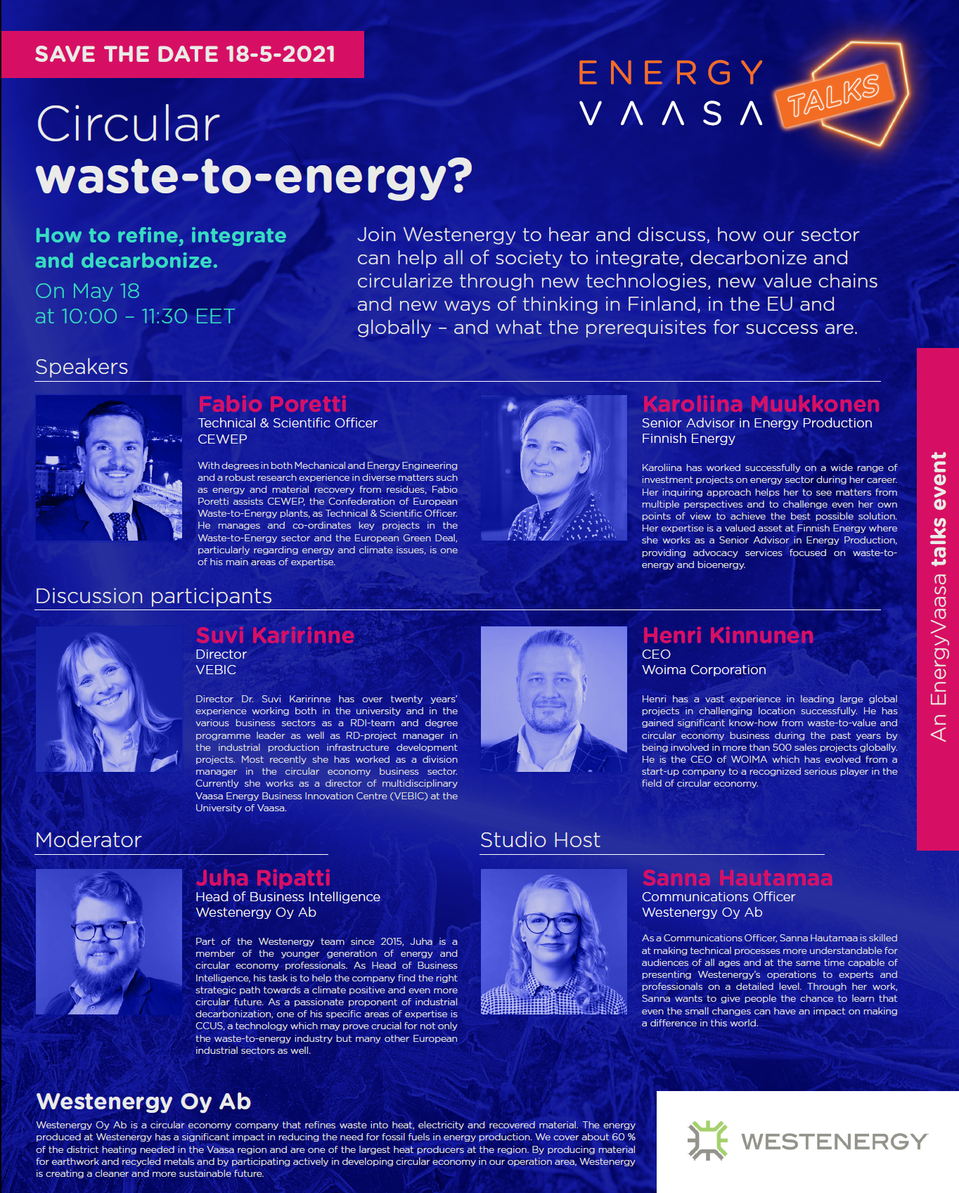 Westenergy welcomes you to hear how the waste-to-energy sector can help all of society to integrate, decarbonize, and circularize through new technologies, new value chains and new ways of thinking – and what the prerequisites for success are.