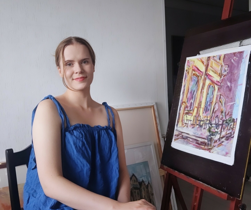 Olivia: “Kesäkatu” painting was born out of the many moments I have stopped and admired the street of Hovioikeudenpuistikko. I like painting cityscapes and recently I have been painting Vaasa more and more.