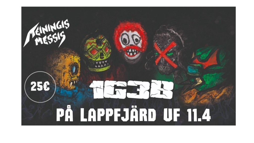 Den 11 april är det dags för en kväll du inte vill missa! Lappfjärd UF blir kvällens självklara samlingsplats för fest och glädje när 1G3B intar scenen, och Meiningis Messis värmer upp publiken som förband. Dörrarna öppnas kl. 20 och festen fortsätter ända till kl. 03 – en hel kväll fylld av energi, musik och stämning på topp.