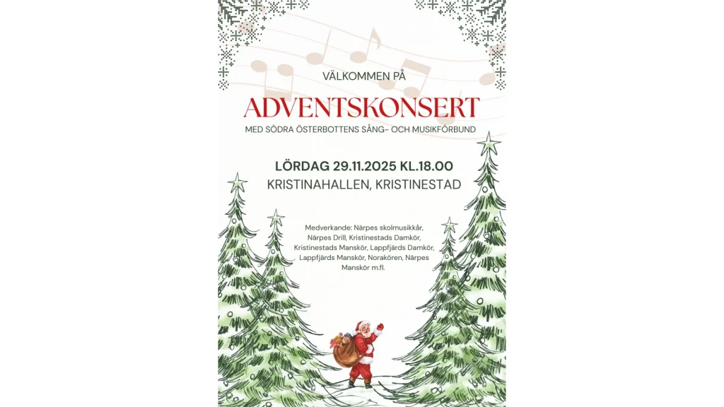 Södra Österbottens Sång- och Musikförbund håller Adventskonsert i Kristinahallen 29. 11 2025 kl. 18.00. Medverkande: Närpes skolmusikkår och Närpes Drill, Norakören, Närpes manskör, Kristinestads Damkör och Manskör, Lappfjärds Damkör och Manskör m.fl.