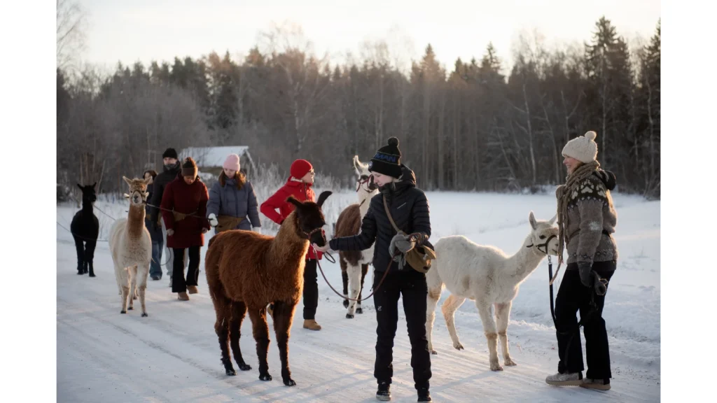 You get to know alpacas more closely and we take together a peaceful walk with them to the forest (2km).