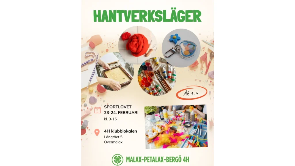 Ett hantverksläger under sportlovet för årskurs 1–4 där vi provar på olika hantverk