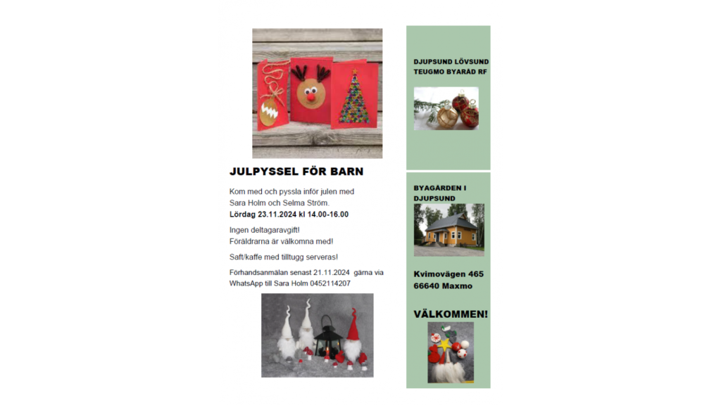 Förhandsanmälan senast 21.11.2024 gärna via WhatsApp till Sara Holm 0452114207