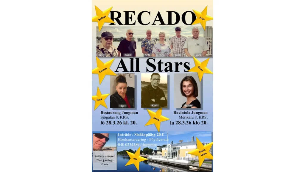 Älä missaa RECADO-All Stars tapahtumaa la 28.3.2026 klo 20, Jungman Restaurant Cafe Bar. Vierailevia solisteja ovat Kia Pohjonen, Gajane Petrosjana ja Kjell Granfors. Juontajana toimii Janne Lindström.