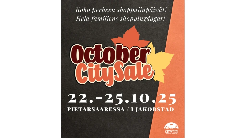 Tule ja nauti hienoista syystarjouksista October City Salen aikaan Pietarsaaressa. Shoppailupäivien aikana monet keskustan jäsenyrityksistä arjoavat huippu tarjouksia ja kampanjoita. Tervetuloa tekemään ostoksia paikallisesti!