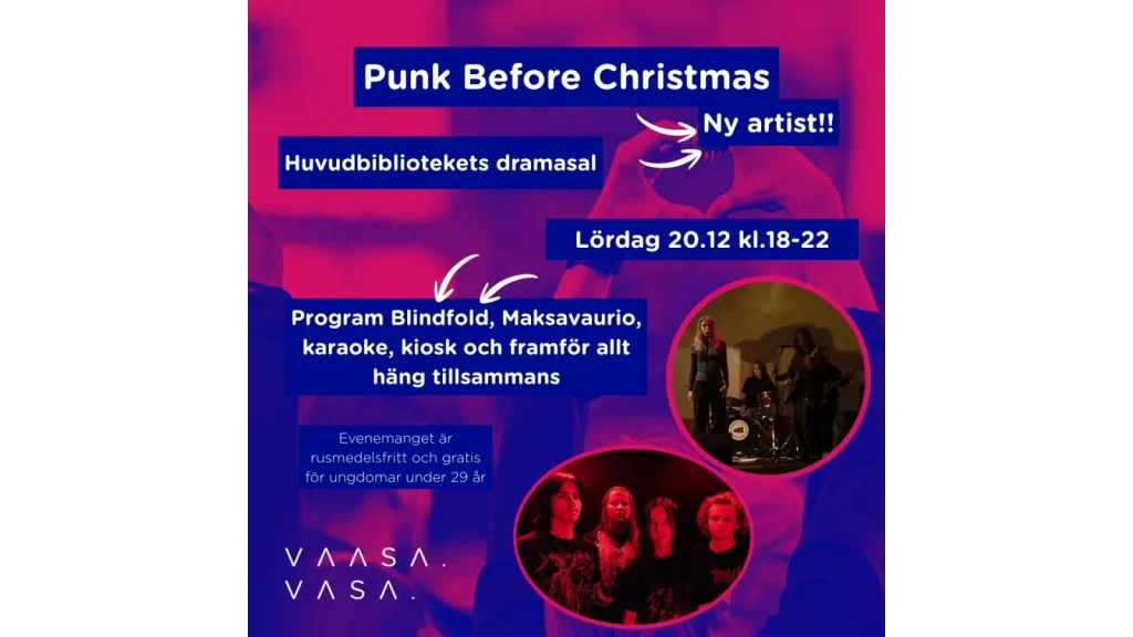 At Vaasa City Library’s Drama Hall on 20.12.2025 during 18-22 o’clock, we’ll rock to the sounds of Blindfold and Maksavaurio and sing karaoke. Come hang out with friends and enjoy a fun evening!