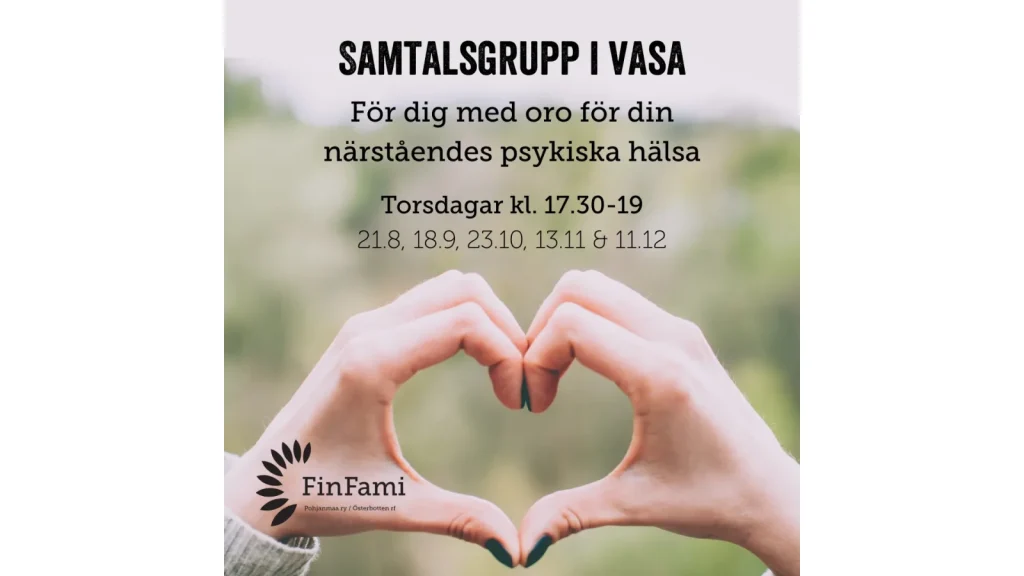 Är du orolig för din närståendes psykiska ohälsa och för din egen ork? Din närstående kan vara ditt vuxna barn, din partner, ditt syskon eller någon annan som står dig nära. I samtalsgruppen har alla sin unika historia, men samtidigt också mycket som förenar. Du behöver inte känna dig ensam. Känslor av oro, sorg och maktlöshet är vanliga. I gruppen kan vi dela våra känslor. Vi diskuterar också vården, socialskyddet och hur vi i första hand behöver tänka på att ta hand om oss själva för att orka. I gruppen är kamratstödet det viktigaste, men vi kan också använda oss av olika övningar. Om det finns intresse kan vi också bjuda in gäster.