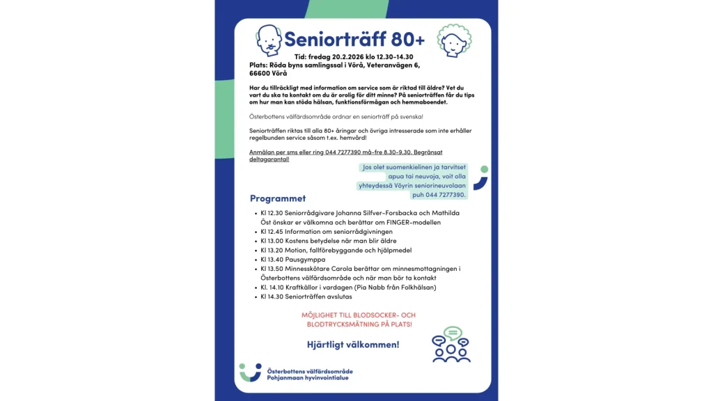 Har du tillräckligt med information om service som är riktad till äldre? Vet du vart du ska ta kontakt om du är orolig för ditt minne? På seniorträffen får du tips om hur man kan stöda hälsan, funktionsförmågan och hemmaboendet. Seniorträffen riktas till alla 80+ åringar och övriga intresserade som inte erhåller regelbunden service såsom t.ex. hemvård. Tid: fredag 20.2.2026 klo 12.30-14.30. Plats: Röda byns samlingssal i Vörå, Veteranvägen 6, 66600 Vörå. Anmälan per sms eller ring 044 7277390 må-fre 8.30-9.30. Begränsat deltagarantal! OBS! Vi utför också blodsocker- och blodtrycksmätningar på plats! Välkomna!