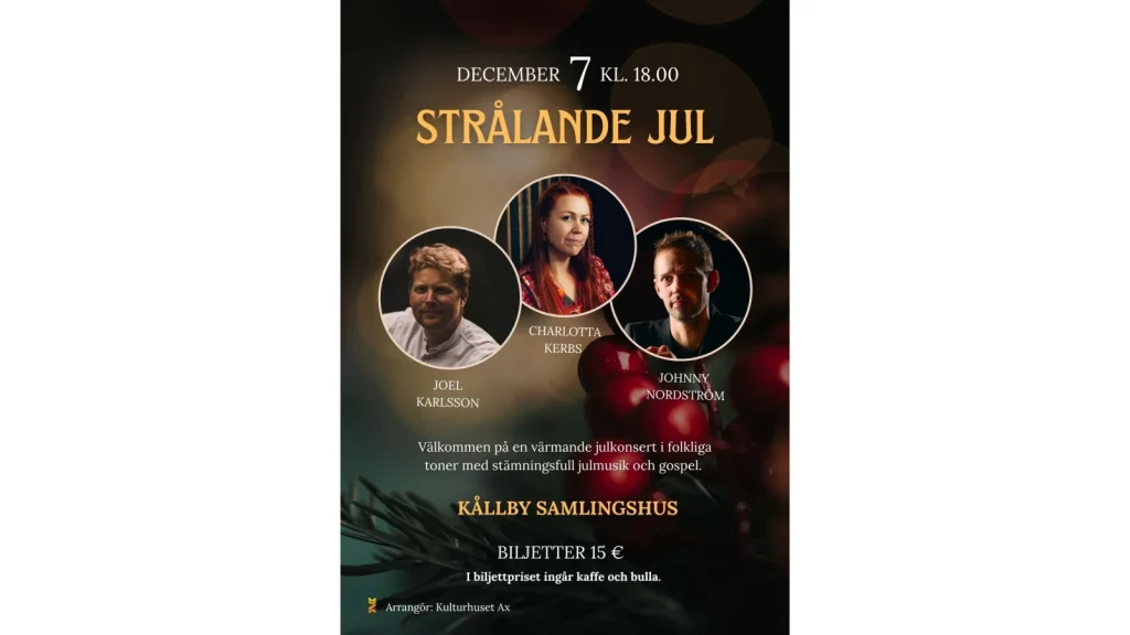 Hjärtligt välkommen på en värmande julkonsert med musikerna Charlotta Kerbs (sång), Johnny Nordström (piano) och Joel Karlsson (gitarr). Under konserten framförs stämningsfull och berörande julmusik och gospel, och det bjuds på välbekanta julsånger i folkliga melodivarianter från Finland och Sverige. Vi får landa mjukt och varmt i en omfamnande julstämning, med folkliga toner från när och fjärran som skänker glädje, hopp och ljus.