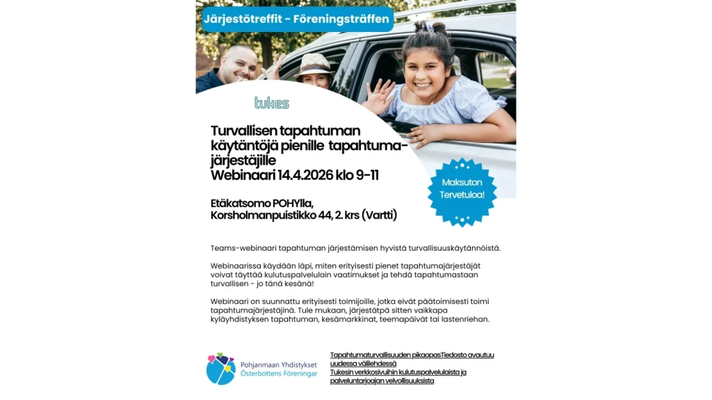 Webinaari on suunnattu erityisesti toimijoille, jotka eivät päätoimisesti toimi tapahtumajärjestäjinä. Tule mukaan, järjestätpä sitten vaikkapa kyläyhdistyksen tapahtuman, kesämarkkinat, teemapäivät tai lastenriehan.