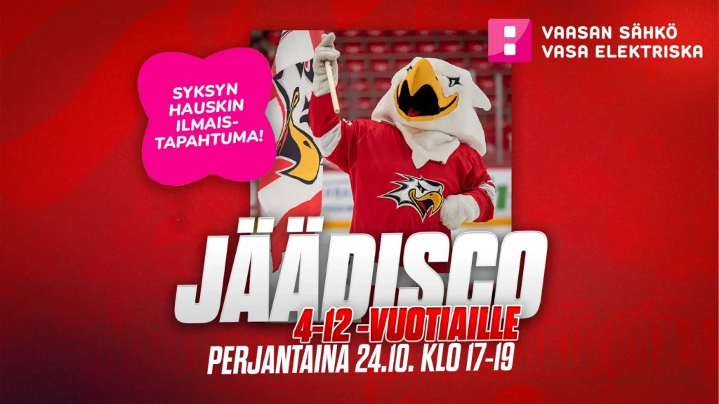 Syksyn kivoin ilta lähestyy! ❤️🤍 Tämän viikon perjantaina 24.10. järjestämme yhdessä @vaasansähkö kanssa klo 17–19 Vaasan Sähkö Areenalla jäädiskon 4–12-vuotiaille lapsille. 🤩 Luvassa kilpailuja, maalintekoa, luisteluratoja sekä mehua ja keksejä. Mukana menossa Redi-maskotti. 🦅