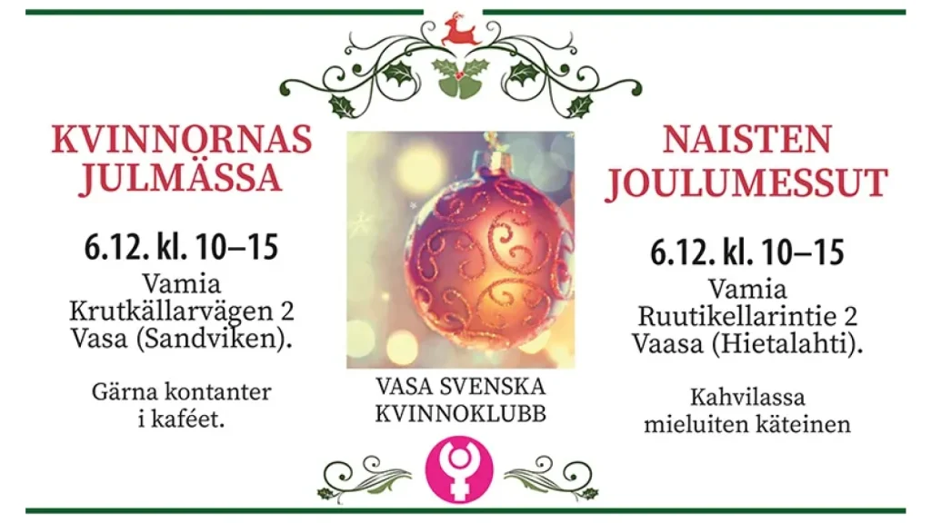 For vendors: The digital booking for market stalls opens on Monday, 13th October at 6 p.m. on our web site Vasa svenska kvinnoklubb > Julmässan > Anmälning.
