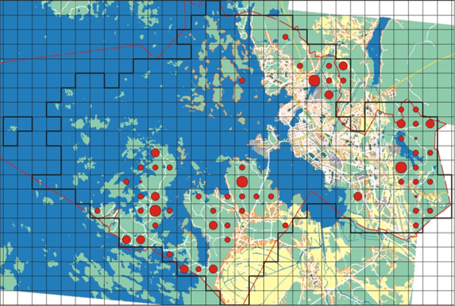 Distribution in Vaasa. During field work conducted during March-June, ravens were observed in about 50 locations. However, reliability was hampered due to the raven’s vast territories. It may search for food for their young tens of kilometers away from the nest, thus the same bird is likely to be observed over several survey blocks. Furthermore, like other corvids, some are likely non-territorial juvenile birds wandering around over vast areas during summer. In Vaasa, the common raven is usually observed during nesting season in vast forest areas around the Pilvilampi lake, in Öjen or Utterö. Courting rituals take place from February to March and includes skillful aerial acrobatics and loudly claiming their territories.
