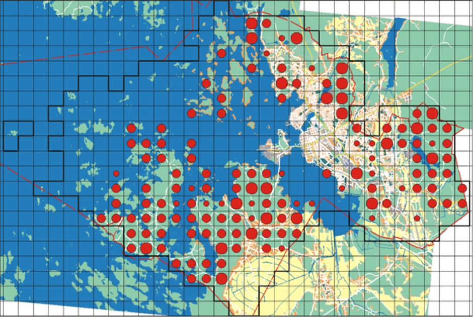 Distribution in Vaasa. The crested tit was observed in about 120 survey blocks in Vaasa during the nesting season in April and May. The species occurs mainly in uniform coniferous forests bordering built-up areas of the city. The species is absent from the city centre and the vast farmlands in Sundom. It can be most easily spotted in Öjen, Öjberget and in the forests in Kronvik and by Pilvilampi.