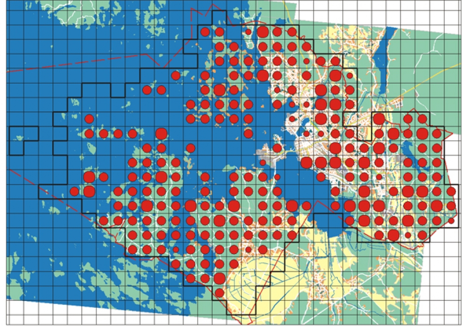 Distribution in Vaasa. The willow tit occurs evenly distributed across the whole survey area. The species has been observed in about 215 survey blocks during the nesting season in April to July and nests in forest areas both on the mainland and in the archipelago. It is, however, absent in the densely built up city centre. It can be found in recreational areas like Öjberget and Pilvilampi, for example.