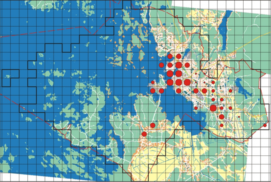 Distribution in Vaasa. The main concentration was focused in and around the city center. During the field work for the Vaasa Bird Atlas, the species was observed in several locations but nesting, however, could not always be confirmed.