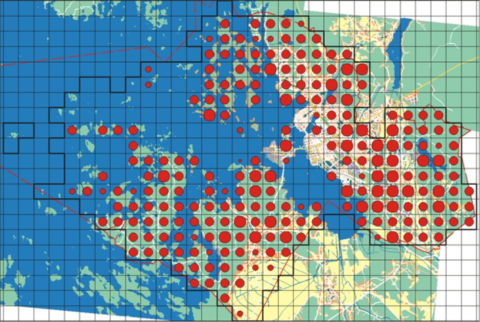 Distribution in Vaasa. Observations indicating nesting common wood pigeons in Vaasa were made in a total of 229 survey blocks. The species is remarkably plentiful in Vaasa and thrives in all types of forests, even in small, fringing forest areas located between human settlements. It is also an abundant nester in the archipelago.