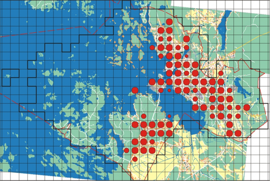 Distribution in Vaasa. The Eurasian tree sparrow is a cultural landscape bird. It is distributed across Vaasa, concentrated heavily along the edges of built up, urban areas. During the nesting season, the tree sparrow was observed in approximately 75 survey blocks. The nesting season begins as early as March and the same pairs can nest twice during the same season. The flocks of the year brood in late summer, clearly indicate that the species has become increasingly common. Flocks of roughly 120 and 60 tree sparrows were observed near Onkilahti and in Vaskiluoto during a 2006 summer survey.