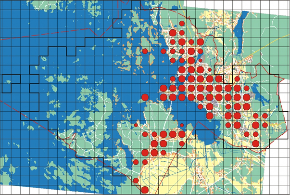Distribution in Vaasa. The house sparrow was found nesting in approximately 80 survey blocks. The distribution pattern closely follows the edges of built up, urban areas. The cityscape functions in specific areas as a habitat for large house sparrow populations.