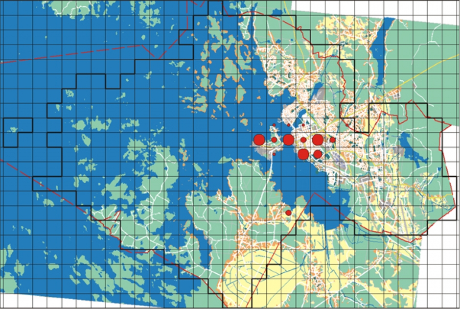 Distribution in Vaasa. A total of 13 locations with nesting rooks where observed during the bird atlas field work conducted from March to July 2005-2008. Tree rookeries were found; in Klemettilä, Vaskiluoto and the Gustavsborg beach. A handful of pairs were possibly nesting along the Korsholmapuistikko-street and in the southern parts of the Sundominlahti bay.