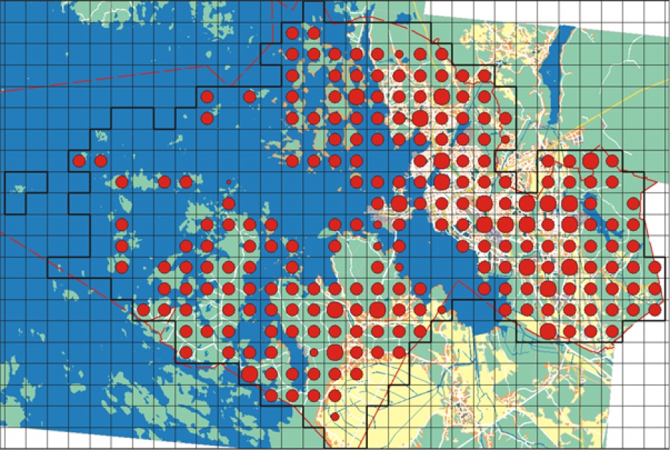 Distribution in Vaasa. The garden warbler was among the most common nesting birds during the survey and was observed in about 220 survey blocks. The species can be found nesting both on the mainland and in the archipelago. It is, however, absent from Söderfjärden’s farmlands, as well as locally in the forests around Öjen and Pilvilampi.