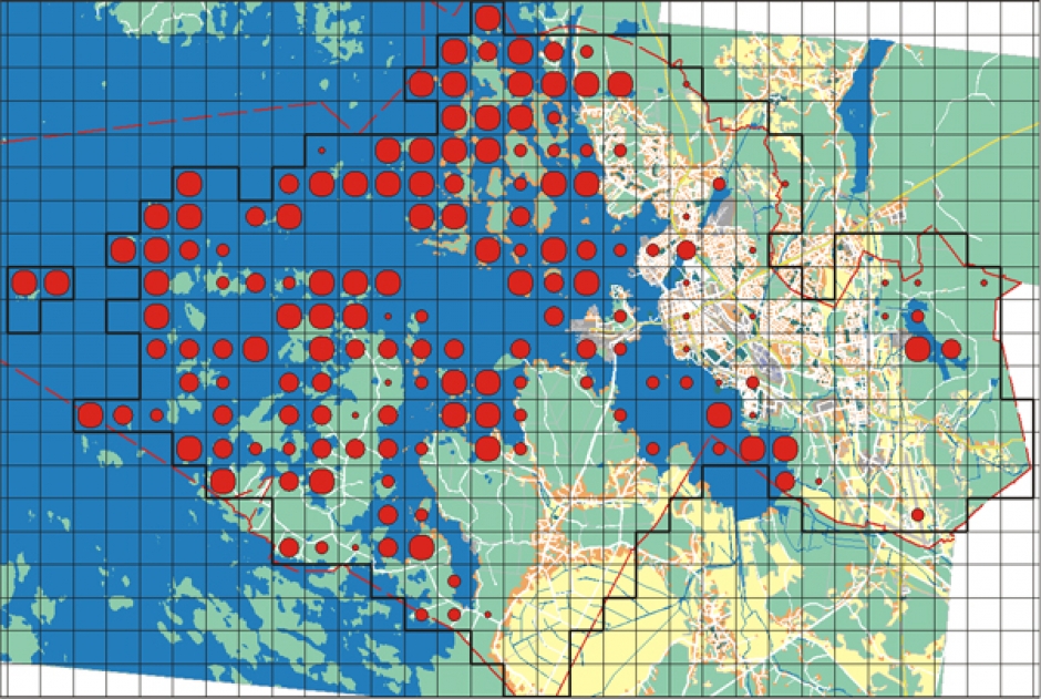Distribution in Vaasa. During 2005-2008 the European herring gull was observed in about 160 survey blocks. The species is common in the outer archipelago, while at the same time having been observed around the Pukinjärvi and Pilvilampi lakes.