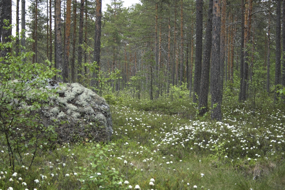 Pine mires are peatlands vegetated by pine trees, marsh Labrador tea and bog bilberry. Common haircap moss and lichen retain moisture in the mire and vegetation growth occurs predominately in the top layers, below which peat forms from decomposing moss. Typical plants growing in pine mires are heather, hare’s-tail cottongrass, cranberry and various species of sundews. Sundews belong to a genus of small carnivorous plants that supplement the mire’s scarcity of nutrients by catching insects. The damp environment is home to mosquitoes and horse flies and various species of birds, such as the tree pipit, that feed on them.