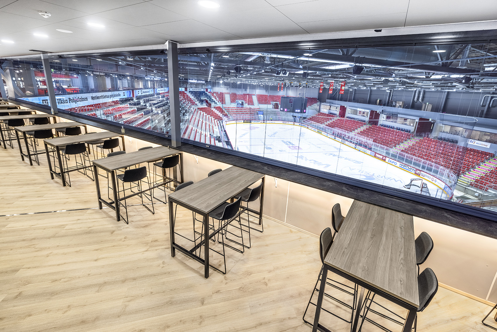 Tyylikäs ylimmän kerroksen ravintolatila on muunneltavissa erikokoisiksi tapahtuma-alueiksi ja helposti brändättävissä yrityksen tai tapahtuman tarpeisiin. Tasokkaasti sisustettu ravintola avautuu areenalle, ja tilasta on suora yhteys VIP-katsomoon.