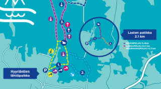 - Viittoihin merkitty jokaiselle reitille oma värikoodi (esim. Marjamäen patikka punainen).
