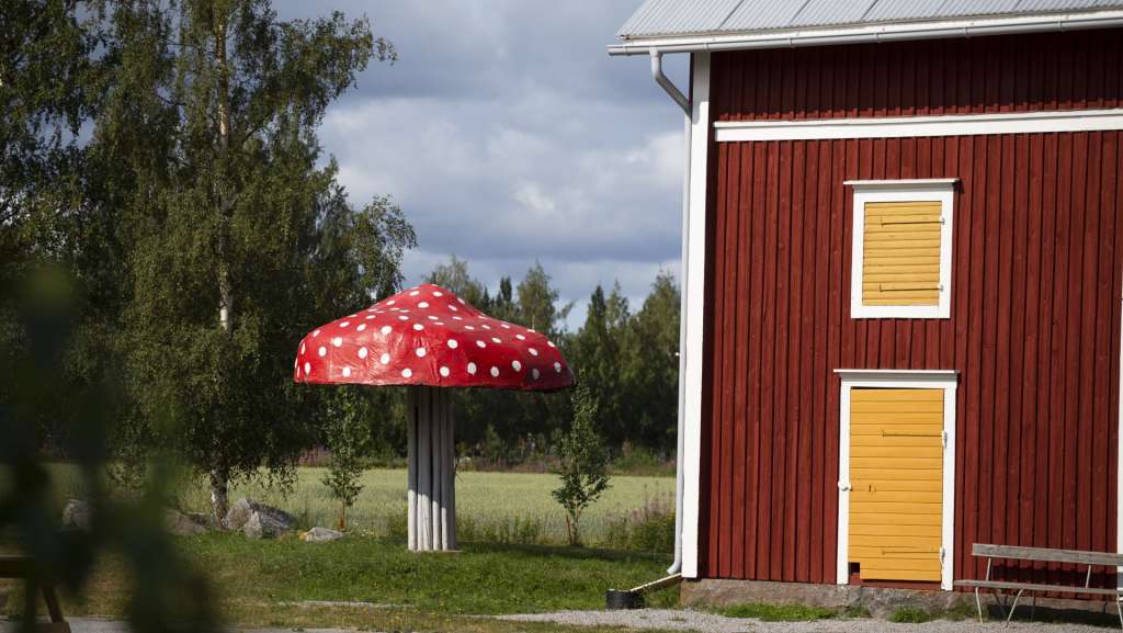 Rökiön Myllytuvan pihassa sijaitseva kärpässieni herättää mielikuvituksen ja antaa sinulle ainutlaatuisen selfien! Kärpässienen punavalkoinen väri sopii hyvin ympäröivien rakennusten valkoisiin nurkkiin. Myllytupa sijaitsee Rökiön kylässä Vöyrillä. Rökiö on peräisin 1400-luvulta ja mylly rakennettiin vuonna 1920. Myllytuvan voi vuokrata erilaisiin tapahtumiin, ja toisesta kerroksesta löytyy Hägglundin valokuvamuseo.