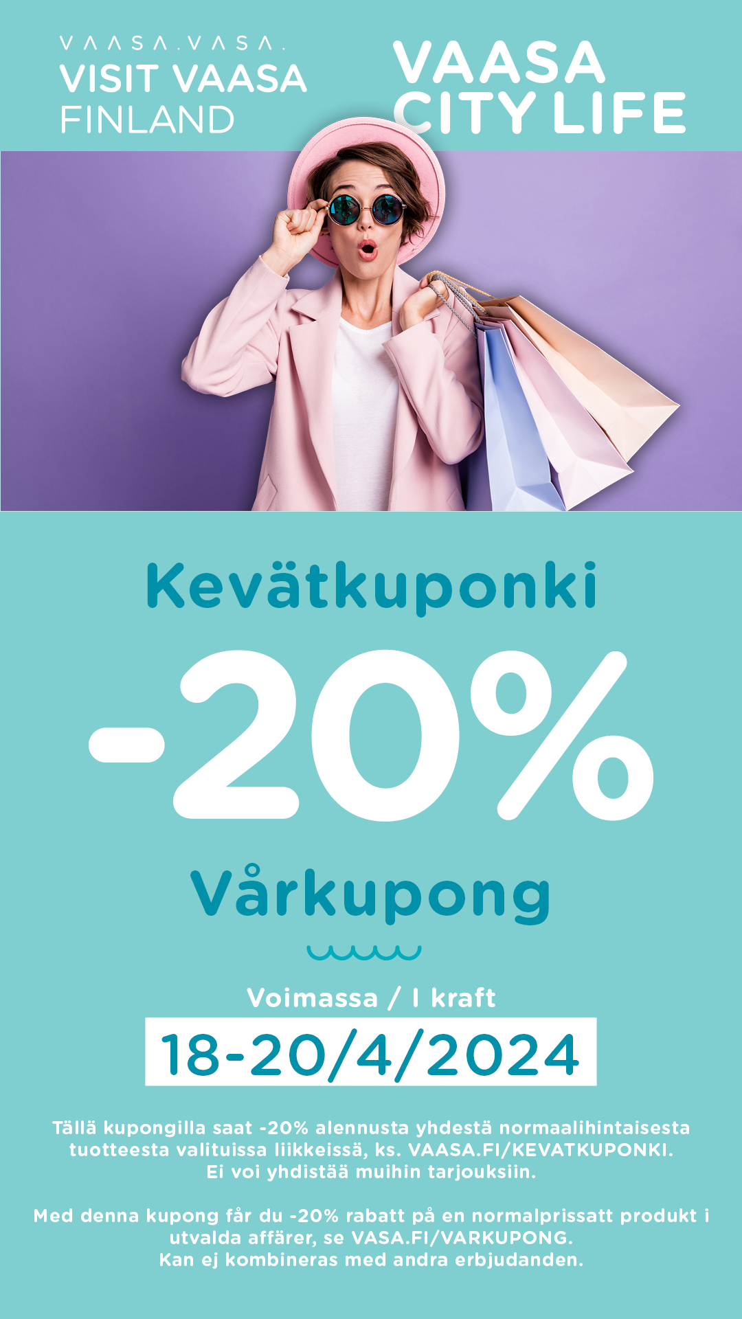 Kevätkuponkia esittäessä kassalla saat -20% alennusta yhdestä vapaavalintaisesta, normaalihintaisesta tuotteesta. Kuponki on voimassa 18.-20.4. välisen ajan Vaasan keskustassa. Ei voi yhdistää muihin tarjouksiin. Ei koske lahjakortteja, alkoholituotteita tai lääkkeitä. 1 kuponki/liike/asiakas.