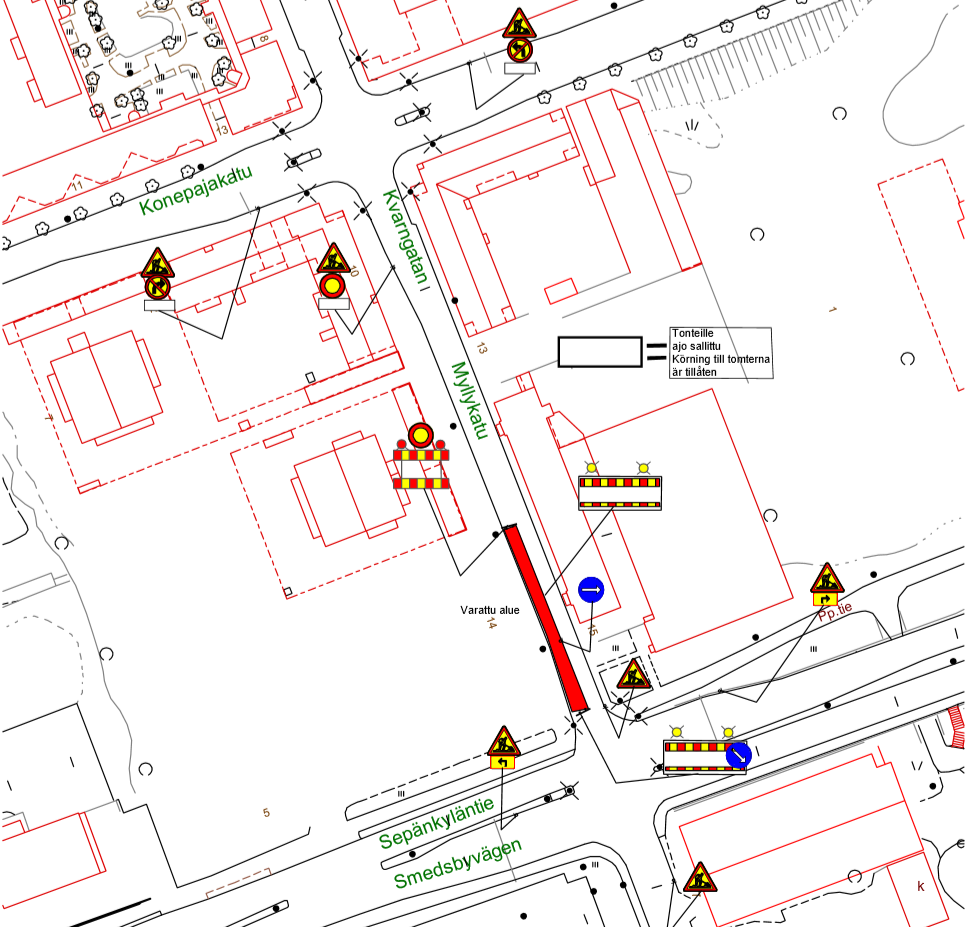 På grund av gatuarbeten måste den ena körfilen vid Kvarngatan 14 stängas 1.6. Körfilen från Kvarngatan till Smedsbyvägen är stängd i ungefär en vecka. Körfilen i andra riktningen är öppen som normalt. Körning till tomterna är tillåten.