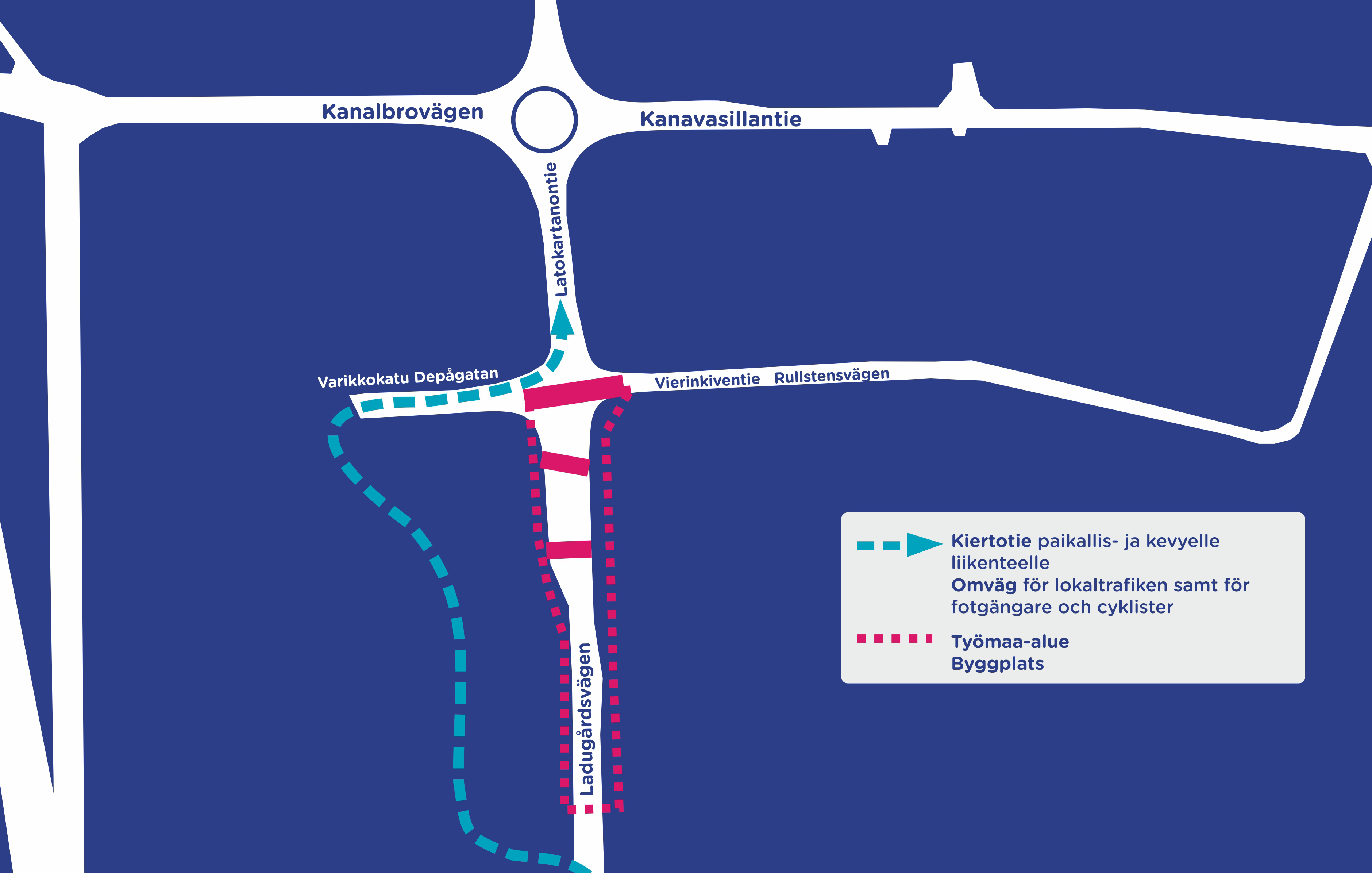 Ladugårdsvägen stängs för trafik på avsnittet mellan Kanalbrovägen och Farmarevägen under tiden 12.4–18.4. På detta gatuavsnitt förnyas vatten- och avloppslinjen, vilket förutsätter att Ladugårdsvägen grävs upp.