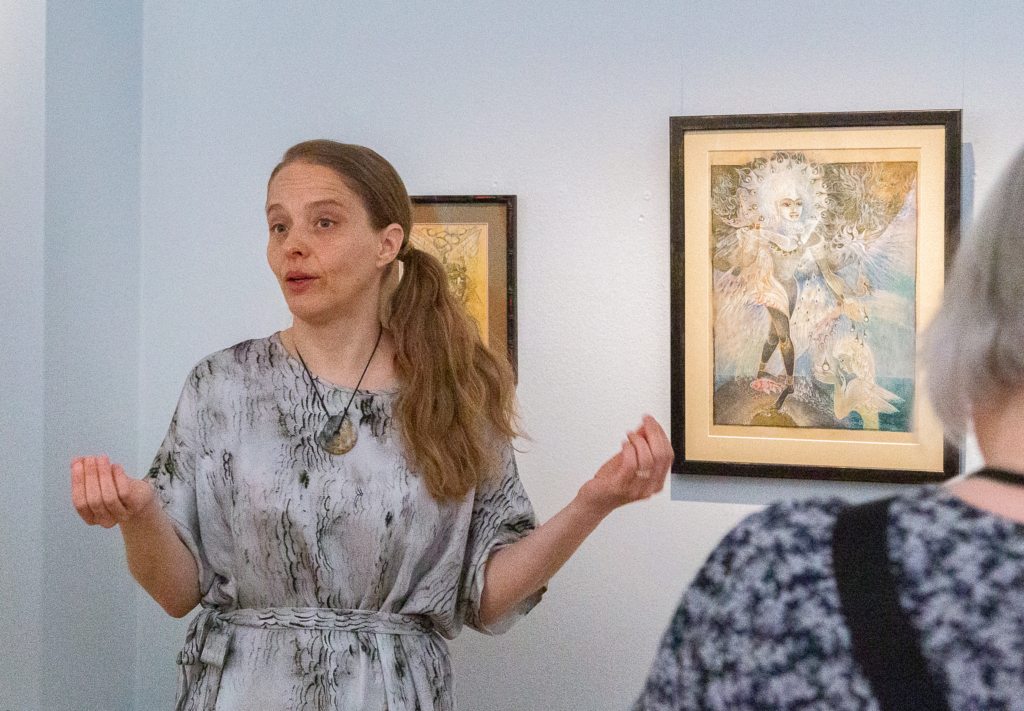 På rundvandringen får vi bekanta oss med utställningen Österländsk andlighet under ledning av Nina Kokkinen, som arbetar som forskardoktor vid Donnerska institutet. Konst- och religionsforskaren Nina Kokkinen har agerat kurator för utställningen.
