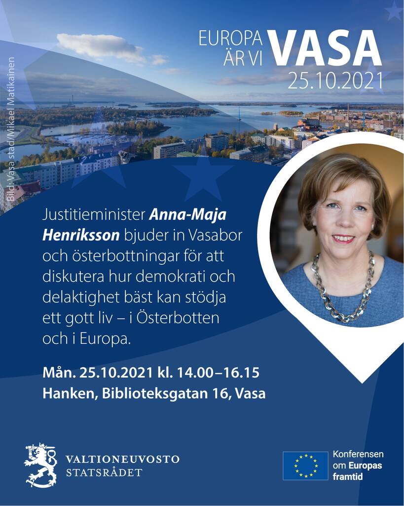 Justitieminister Anna-Maja Henriksson bjuder in alla Vasabor och österbottningar att dela med sig av sina tankar om hur demokrati och deltagande kan stöda lycka och ett gott liv. Evenemanget i Vasa den 25 oktober ingår i Finlands ministrars ”Europa är vi”-turné.