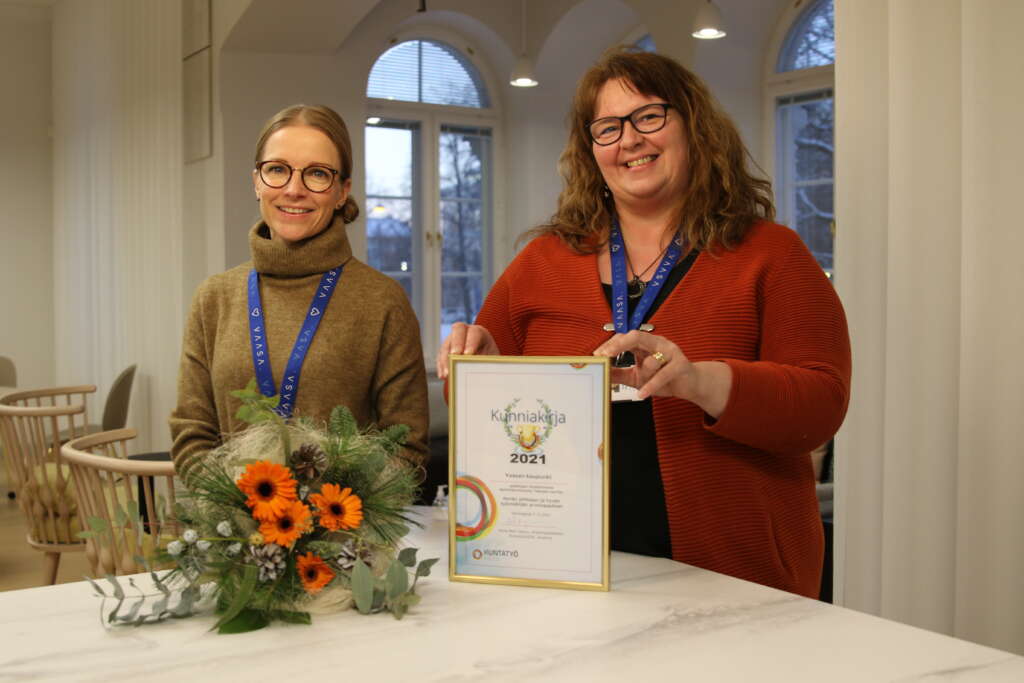 – Erkänslan värmer hjärtat och tacket för det går till alla våra anställda som deltagit i utarbetandet av värdelöftena. Det här sporrar oss också till att fortsätta det aktiva utvecklingsarbetet. Arbetsgemenskaper, där man stöder varandra och arbetar för samma mål, klarar sig också bättre när det blir förändringar. Det här har säkert hjälpt oss också över de utmaningar som undantagsförhållandena under den senaste tiden har medfört. Tillsammans får vi till stånd fina saker – gläder sig Vasa stads personaldirektör Tuulikki Kruhse-Poutanen.