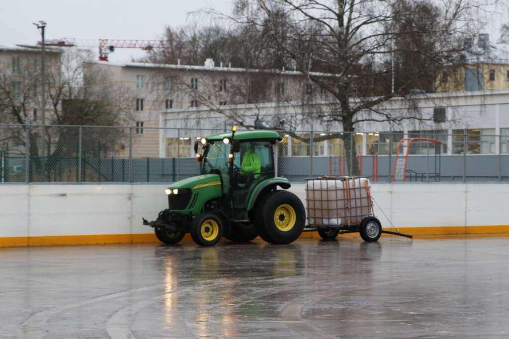 – Ett väl tilltaget snötäcke skulle göra att det gick snabbare att få till stånd grunden för skridskoplanerna. Då skulle man genast få ett tjockare lager is, på vilket man småningom kunde frysa ner ytlagren, berättar arbetsledare Janne Mattila.