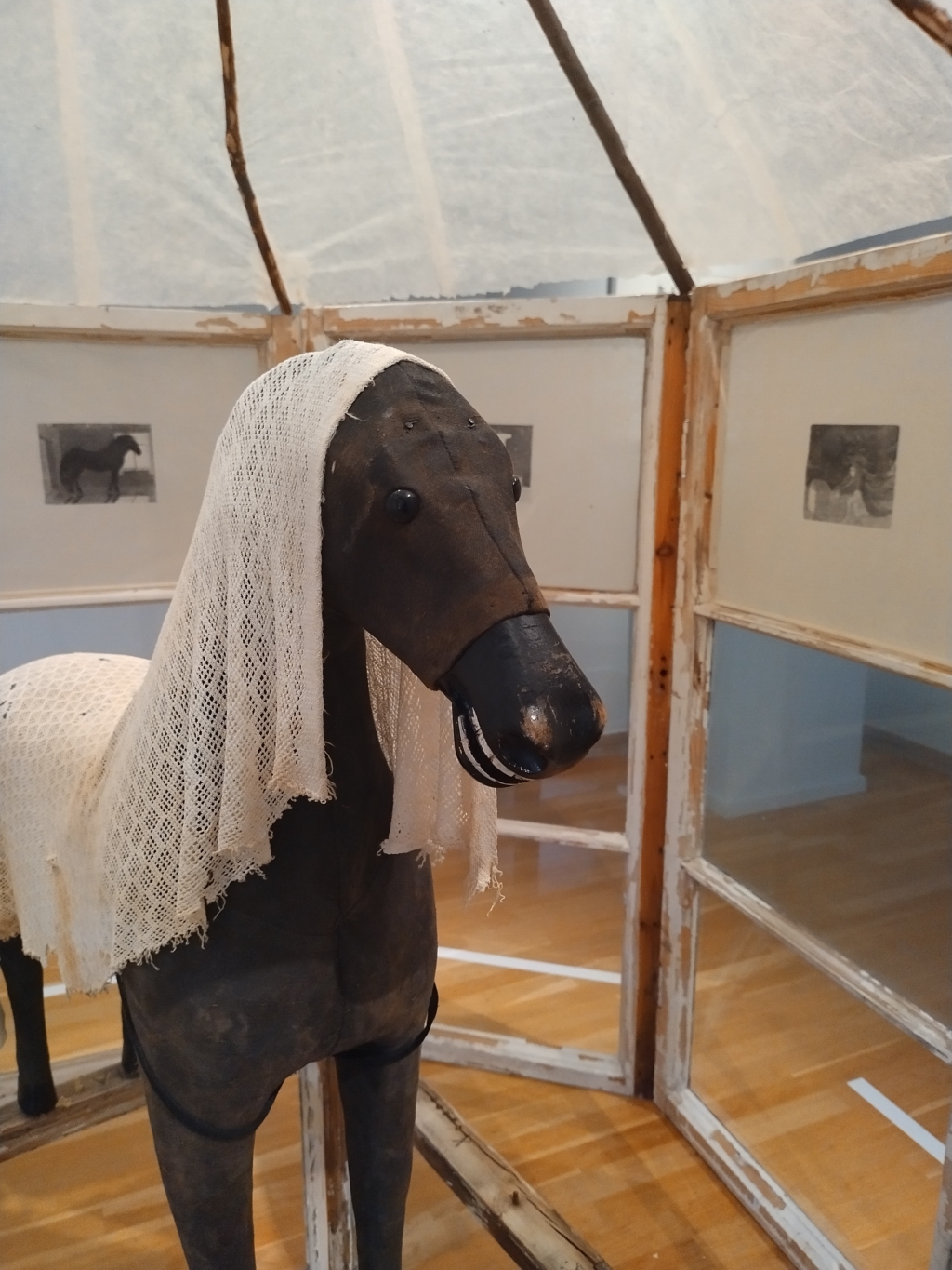 Bilderna visar Outi Heiskanens verk Karusell från 1986. Verket är som ett reseminne från Afghanistan som Heiskanen besökte 1968. Konstnären kikade där in i en stupa, ett buddhistiskt, runt monument, och mötte där enligt sina egna ord ett buddhistiskt helgon – och en åsna som förirrat sig in i byggnaden. Heiskanen gjorde flera andra resor bland annat till Indien, Tibet och Nepal, och hade ett stort intresse för asiatisk andlighet och filosofi.