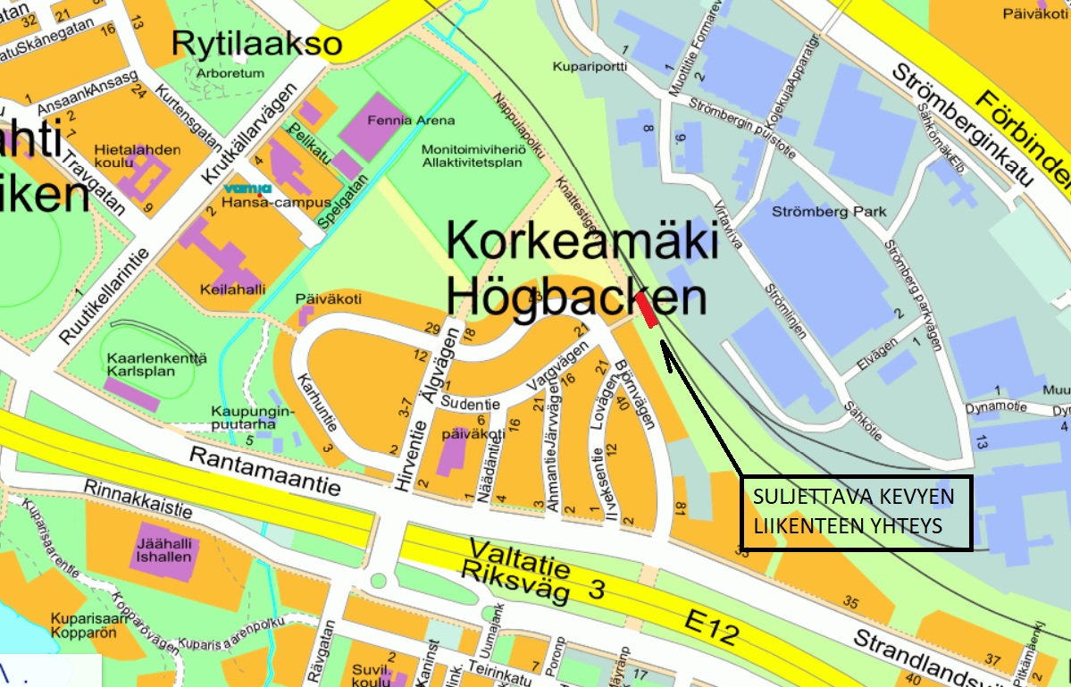 Vasa stad bygger en ny gata, Östra bangatan, på området mellan Strömberg Park och järnvägsbanan. På grund av byggarbeten är Vargvägens övergång för cykel- och gångtrafik mellan Högbacken och Strömberg Park avstängd till 31.7.2021.