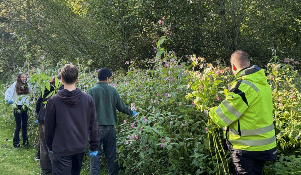 Efter en kort stund med undervisning fick eleverna själva ge sig i kast med fenomenet, då gruppen förflyttade sig till ett bestånd av jättebalsamin som finns på Lärkträdsvägen.