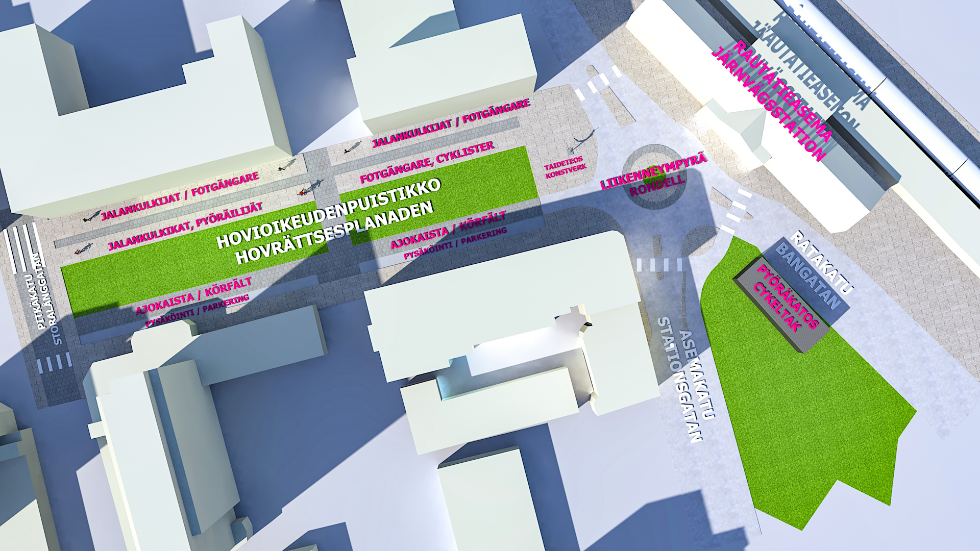 I planen tas taxiplatserna framför gamla Posthuset bort och i stället förlängs esplanaden. Norra sidan av Hovrättsesplanaden anvisas som gång- och cykelväg och fordonstrafiken flyttas i sin helhet till södra sidan av esplanaden. Samtidigt anläggs en cirkulationsplats framför stationen och i stationsparken byggs ett cykelstall, där man tryggt kan lämna sin cykel.