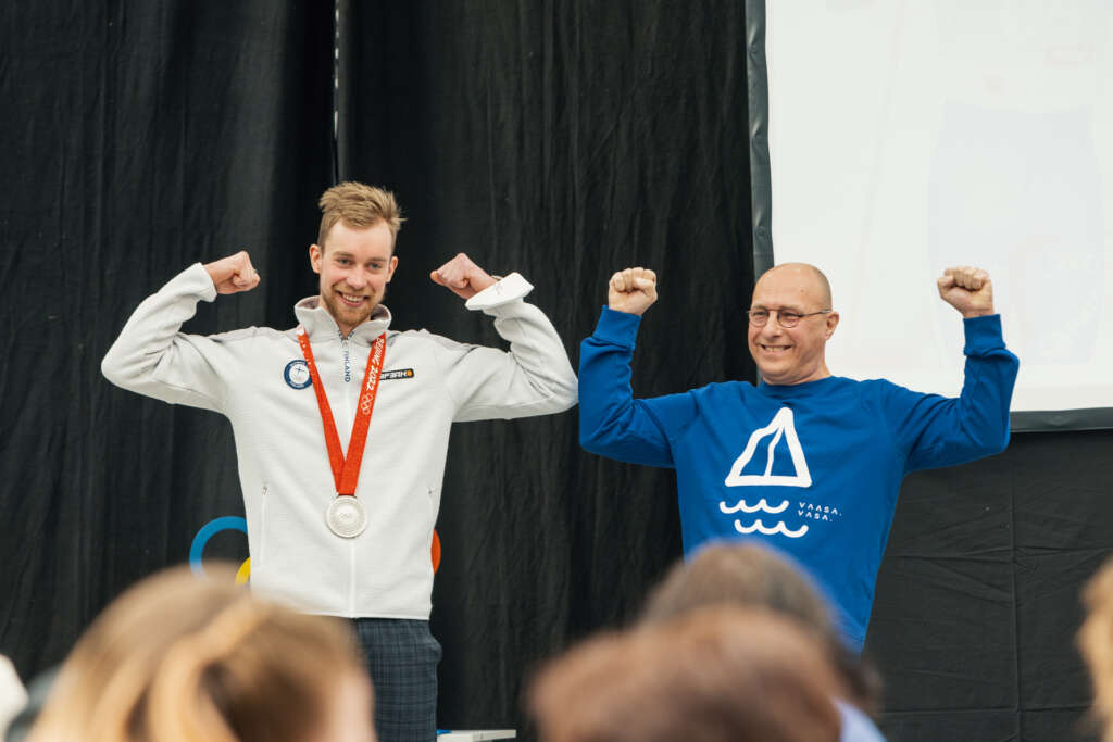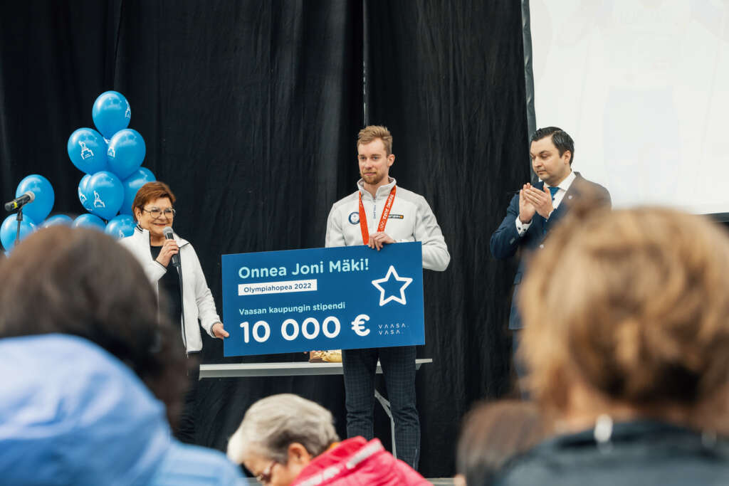 Vasabon Joni Mäki tog silver med Iivo Niskanen i parsprinten för herrar i OS i Peking i februari 2022. Vasa stad belönade Mäki på en tillställning för allmänheten som ordnades söndag 10.4.