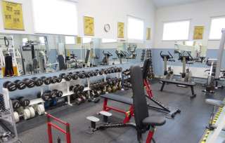 I styrketräningslokalen finns traditionella träningsmaskiner och ett separat område för träning med fria vikter.