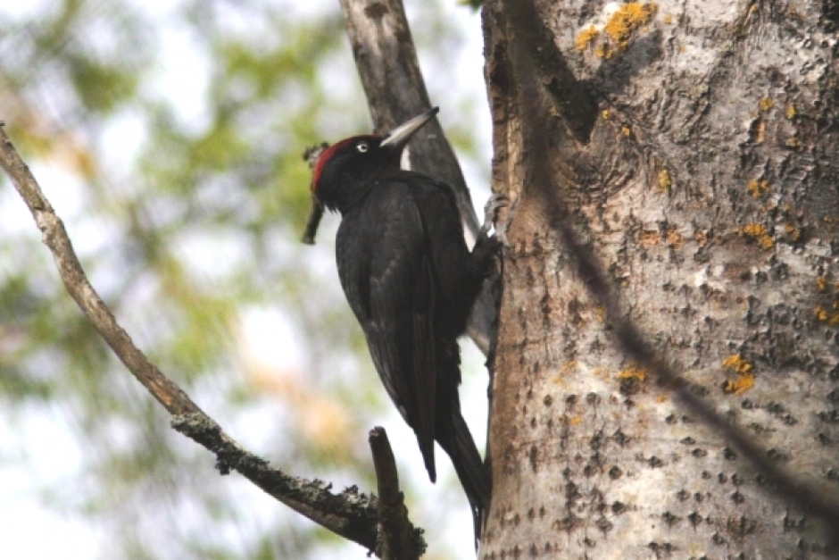 - Hackar ett lodrätt bohål, vanligen i en tall eller asp