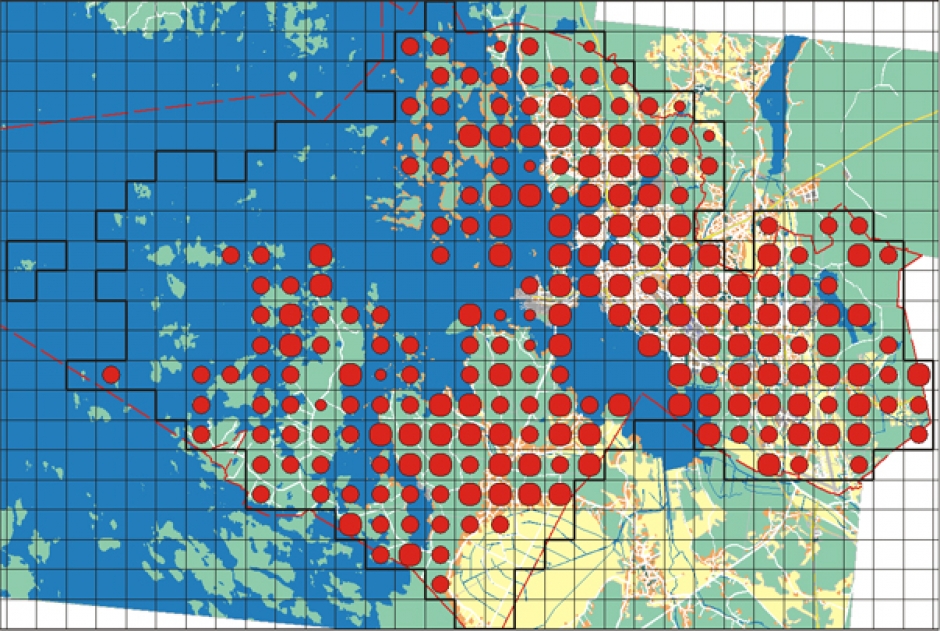 Förekomst i Vasa. Enligt de observationer som gjordes i terrängen under arbetet med Vasa fågelatlas kan blåmesen för tillfället anses vara en allmän häckande fågel. Blåmesen har hittats i över 200 atlasrutor under häckningssäsongen, till utbredningen är den alltså nästan lika vanlig som exempelvis grönsiskan. Blåmesen förekommer främst i kulturmarker, men häckar även längre från bebyggelse, exempelvis i Gerby skärgård och i barr- och blandskogar i utkanten av staden.